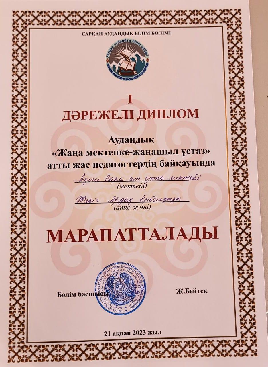 Аудандық "Жаңа мектепке - жаңашыл ұстаз" атты жас педагогтердің байқауында жас маман Жеңіс Ардақ Ерболқызы I дәрежелі дипломмен марапатталды. Тәлімгерi Сарсембаева Роза Адильжомартовна