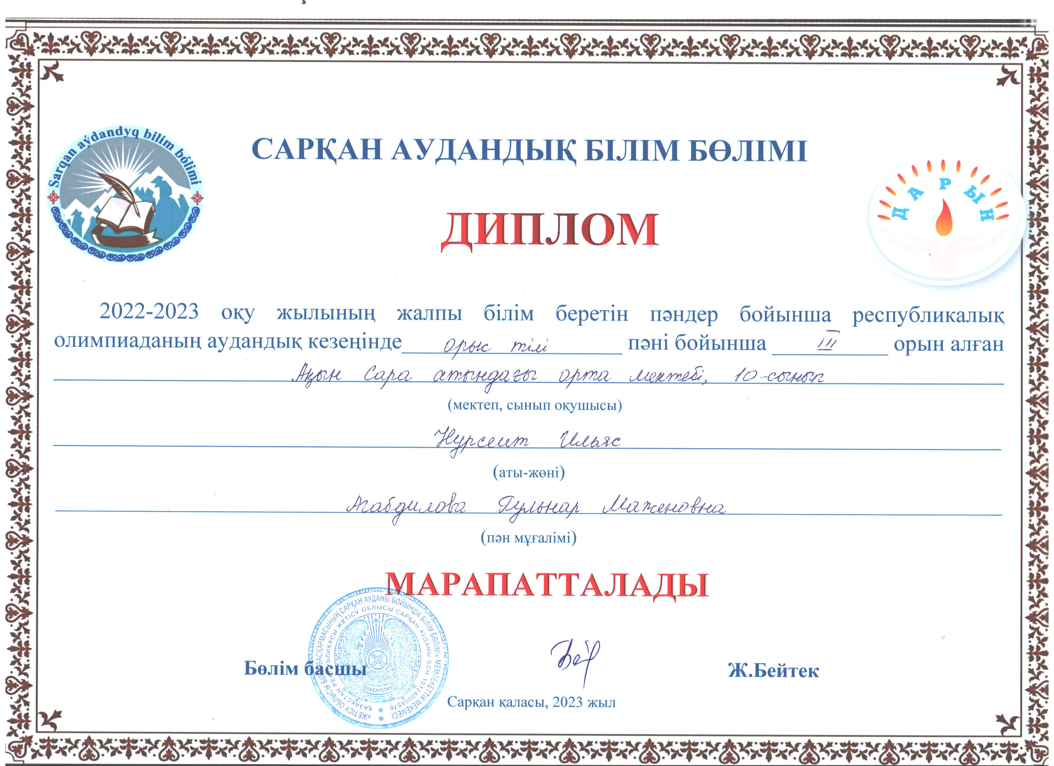 Аудандық пән олимпиадасының қорытындысы (Орыс тілі) » Жетісу облысы Сарқан ауданы Ақын Сара атындағы орта мектеп